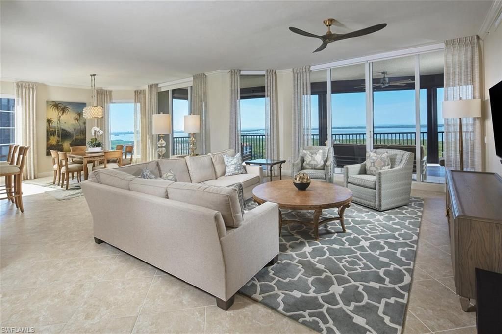 This corner residence in Treviso offers a bright, wraparound perspective of The Colony’s impeccably manicured grounds. From the moment you step off your private elevator, you are greeted by an airy, open-concept design where the indoors and outdoors blur beautifully. Whether you are hosting a formal dinner or enjoying a quiet morning in the charming breakfast nook, the backdrop is always spectacular. Bathed in natural light, the interior is defined by floor-to-ceiling glass and soaring 9...This corner residence in Treviso offers a bright, wraparound perspective of The Colony’s impeccably manicured grounds. From the moment you step off your private elevator, you are greeted by an airy, open-concept design where the indoors and outdoors blur beautifully. Whether you are hosting a formal dinner or enjoying a quiet morning in the charming breakfast nook, the backdrop is always spectacular. Bathed in natural light, the interior is defined by floor-to-ceiling glass and soaring 9’8” ceilings that frame sweeping panoramic views of the Gulf. The meticulously curated floor plan features three ensuite bedrooms, a private study, and a versatile family room, all flowing seamlessly into formal living and dining spaces. Treviso’s updated common areas feature transitional furnishings and marble floors with views over water features. Three guest suites, which include a two bedroom apartment. A beautiful secure lobby, elegant social room, billiards room, theater, and a newly updated fitness center complete the interior amenities. Spa and free form large pool with graceful beach access and a separate social pavilion. The Bay Club, a Colony private waterfront dining facility, offers intimate dining or informal sunset dining/entertainment. Experience a full array of community amenities such as a 34 acre island beach park with boat shuttle, Kayaking, canoeing, tennis, pickle ball, bocce and sailing. Close to Coconut Point Shopping Center. 15 minutes to the airport.