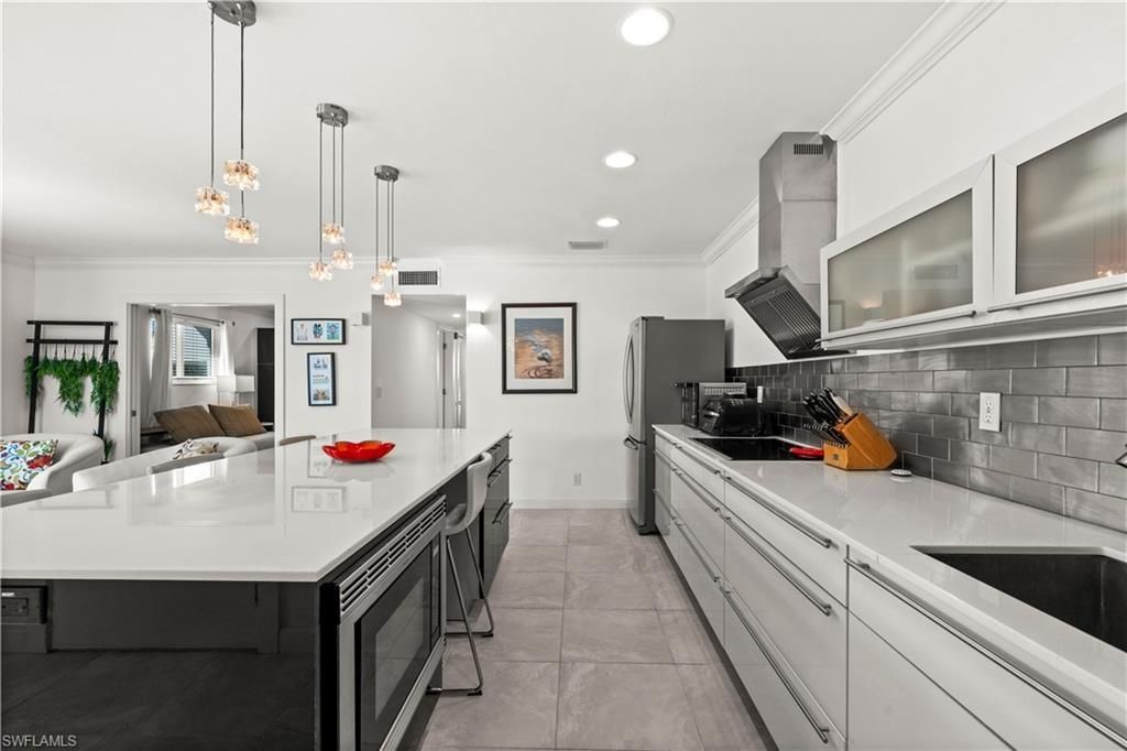 Location, location, location! This is a rare opportunity to own a fabulous, bright, sun-filled two bedroom + den that can be used as a third bedroom, two bath corner suite in the heart of Old Naples. Situated on the top floor, this residence has been completely renovated and showcases a stunning open-concept layout anchored by a high-end, two-toned white and black modern Italian-style kitchen.Timeless finishes include stainless steel appliances, a sleek stainless steel backsplash, and glamorous ...Location, location, location! This is a rare opportunity to own a fabulous, bright, sun-filled two bedroom + den that can be used as a third bedroom, two bath corner suite in the heart of Old Naples. Situated on the top floor, this residence has been completely renovated and showcases a stunning open-concept layout anchored by a high-end, two-toned white and black modern Italian-style kitchen.Timeless finishes include stainless steel appliances, a sleek stainless steel backsplash, and glamorous white glass countertops that are heat, stain, and mold resistant for effortless maintenance. The kitchen is fully equipped with a Samsung French door refrigerator with internal ice maker, Bosch smooth electric cooktop, ultra quiet Bosch dishwasher, Electrolux convection microwave/oven, wine fridge, pull-out faucet, a large single stainless steel sink, and a slanted stainless steel vent hood with exterior high-CFM venting. Wide pull-out drawers with soft-close hardware, along with built-in cutlery and garbage drawers, complete the space with both style and function.The spacious eat-in lanai overlooks the largest pool in Old Naples, offering serene views and a true resort-style atmosphere. Throughout the home, tile flooring enhances the light, airy feel, while built-in closets in all bedrooms provide excellent storage. The bathrooms feature a walk-in shower and tub, along with a full shower panel complete with jet sprays.This full turnkey condo allows you to live a millionaire's lifestyle without the millionaire price, just steps from world-class dining, shopping, beaches, entertainment, the library, tennis courts, and City Hall. Community amenities include elevators, common BBQ areas, coin-operated washers and dryers on each floor, separate men's and women's washrooms with showers and saunas by the pool, bike storage, and a manual car wash area.The unit includes one designated outdoor parking space, ample guest parking, and a convenient ground-floor storage locker. The condo association is healthy and well managed. Recent upgrades include new hurricane-impact windows and doors throughout, a new hot water tank, and a fully serviced air-conditioning and heating system. Fully turnkey and a pleasure to show. You won't be disappointed!